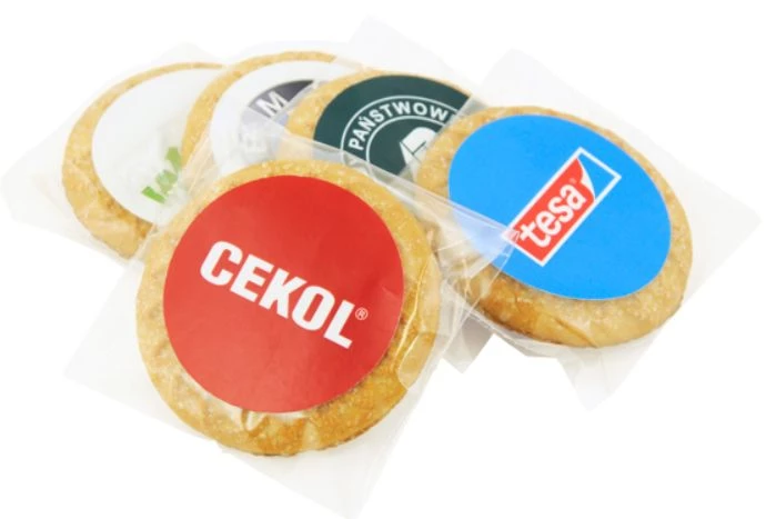 Rozetki z cukrem zapakowane w bezbarwną folię z obustronną etykietą