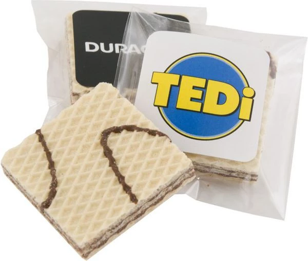 Klasyczne wafelki o kakaowym smaku zapakowane w bezbarwną folię z obustronną etykietą